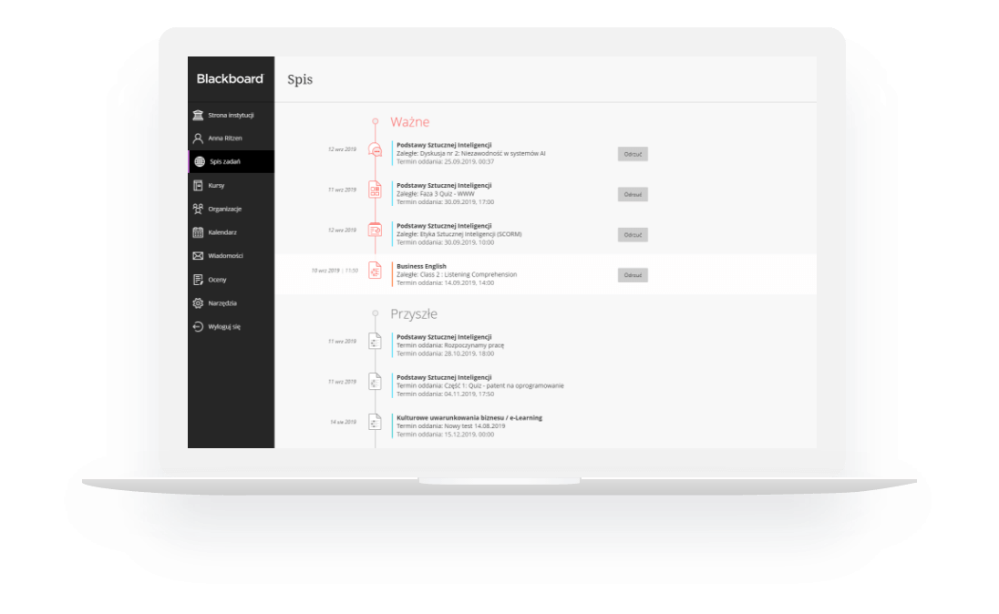 Platforma Blackboard Learn to wszystkie narzędzia potrzebne w procesie planowania, realizacji i monitorowania nauki na odległość, zintegrowane w jednym miejscu.