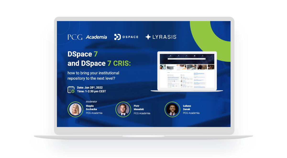 DSpace to najpopularniejsze repozytorium naukowe na świecie, wykorzystywane przez ponad 3,000 instytucji, w tym wiodące szkoły wyższe ze Stanów Zjednoczonych, Wielkiej Brytanii i z Polski. Wiosną 2021 roku, miała miejsce premiera najnowszej wersji DSpace 7, która pod względem technologicznym i funkcjonalnym znacząco przewyższa wszystkie, dotychczas publikowane wersje. Jednocześnie, LYRASIS, organizacja zarządzająca rozwojem DSpace, ogłosiła na swoich stronach internetowych oficjalne zakończenie wsparcia technicznego dla DSpace w wersjach 5 i 6. Na całym świecie trwa wielka migracja. Skorzystaj z usług PCG Academia, aby zaktualizować swoje repozytorium naukowe oparte o DSpace!