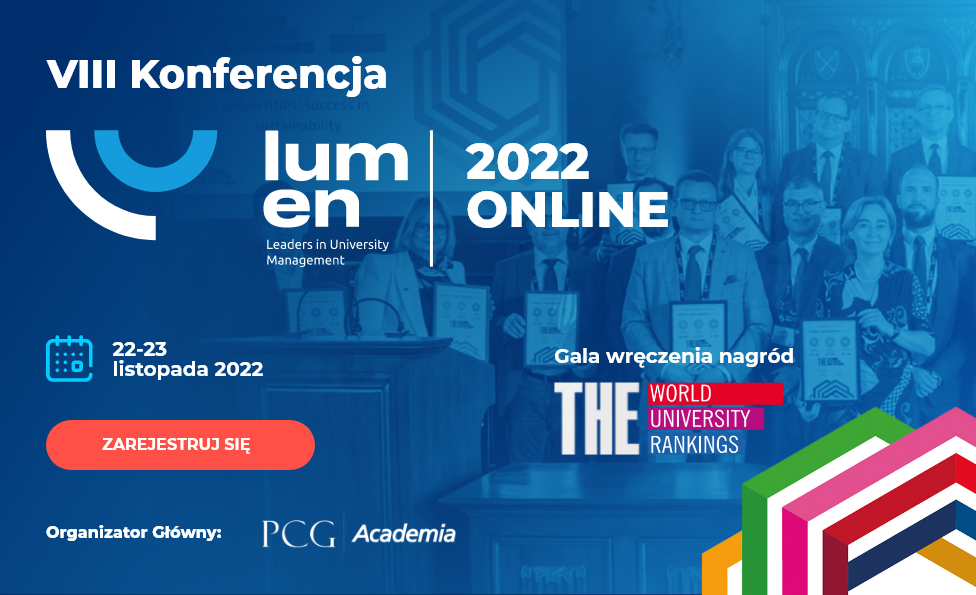 PCG Academia, Times Higher Education i Fundacja Rektorów Polskich zapraszają na ósmą edycję międzynarodowej konferencji dla liderów zarządzania uczelniami – LUMEN 2022. Konferencja odbędzie się w dniach 22 i 23 listopada w formule online i będzie połączona z galą wręczenia nagród dla polskich uczelni, sklasyfikowanych w najbardziej prestiżowym rankingu szkół wyższych na świecie – THE World University Rankings 2022.